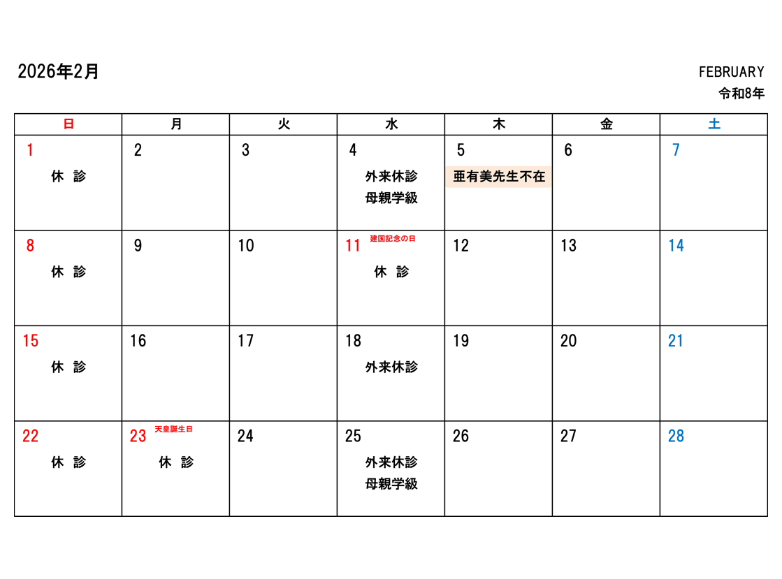 2月5日(木)は、亜有美先生が不在となり、外来診療は医師一人体制となります。